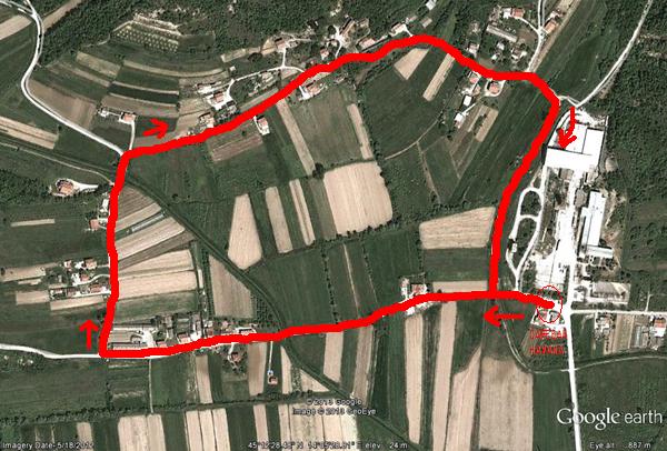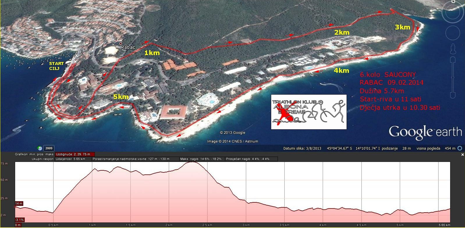 Start je na rivi u Rapcu 9. II. 2104. u 11,00 sati. Trči se od rive po šetnici uz more do crkvice pa gore prema Prohaski te po vatrogasnom putu do Golombere i natrag uz more preko plaže Girandela do cilja na rivi. Ukupne duljina staze iznosi 5700 m, dijelom je makadam, a dijelom asfalt.